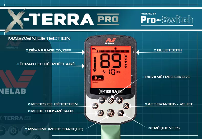 Doté de la Le Minelab X-Terra Pro est un détecteur de métaux polyvalent conçu pour des recherches en milieu terrestre ou aquatique ou terrestre. Étanche jusqu'à 5 mètres de profondeur, il se distingue particulièrement par sa capacité à repérer des cibles, même les plus petites